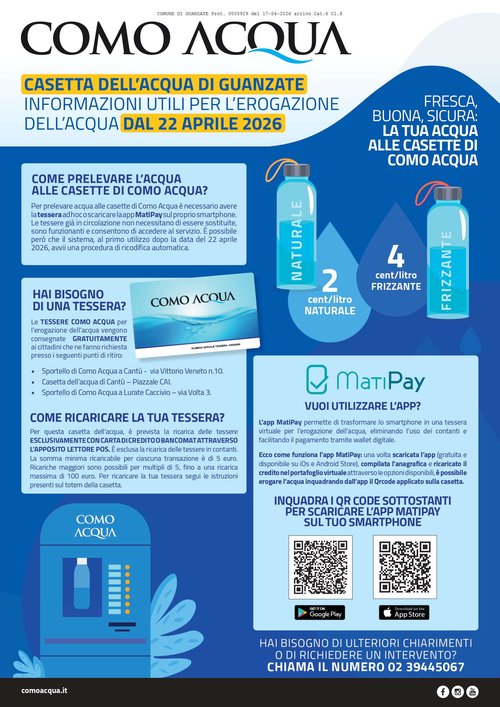 A far data dal 22 aprile 2026 la casetta dell’acqua sita in Piazzale don Gamberi a Guanzate sarà attiva mediante le nuove modalità derivanti dal cambio di gestore.